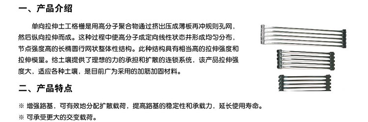單向拉伸的土工格柵是由高分子聚合物經(jīng)擠出壓成薄板再沖規(guī)則孔網(wǎng),然后縱向拉伸而成。這種過程中使高分子成定向線性狀態(tài)并形成分布均勻、節(jié)點強(qiáng)度高的長 橢圓形網(wǎng)狀整體性結(jié)構(gòu)。此種結(jié)構(gòu)具有相當(dāng)高的拉伸強(qiáng)度和拉伸模量,特別是我公司此類產(chǎn)品更具有超國際水平的高早期(伸長率在2%—5%)拉伸強(qiáng)度和拉伸模 量。給土壤提供了理想的力的承擔(dān)和擴(kuò)散的連鎖系統(tǒng)。該產(chǎn)品拉伸強(qiáng)度大(>150Mpa),適應(yīng)各種土壤,是目前廣為采用的加筋加固材料。