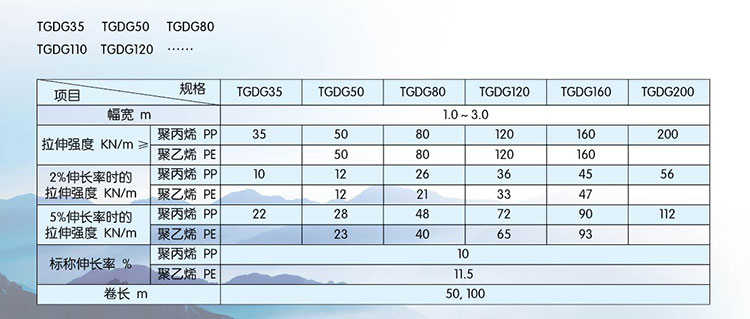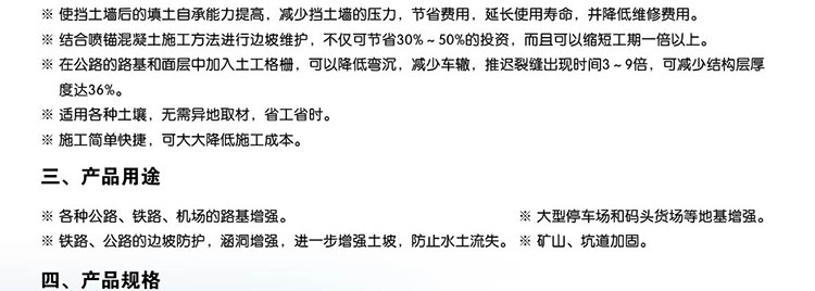 該產(chǎn)品適用于修建公路、鐵路以及江河湖海岸邊的加筋檔土墻、堤壩、橋面、陡坡及土工格室等工程。其作用是可提土墻或堤壩的承載力,延長使用壽命,減少占地面積,縮短工期,降低造價,減小維修費(fèi)用。